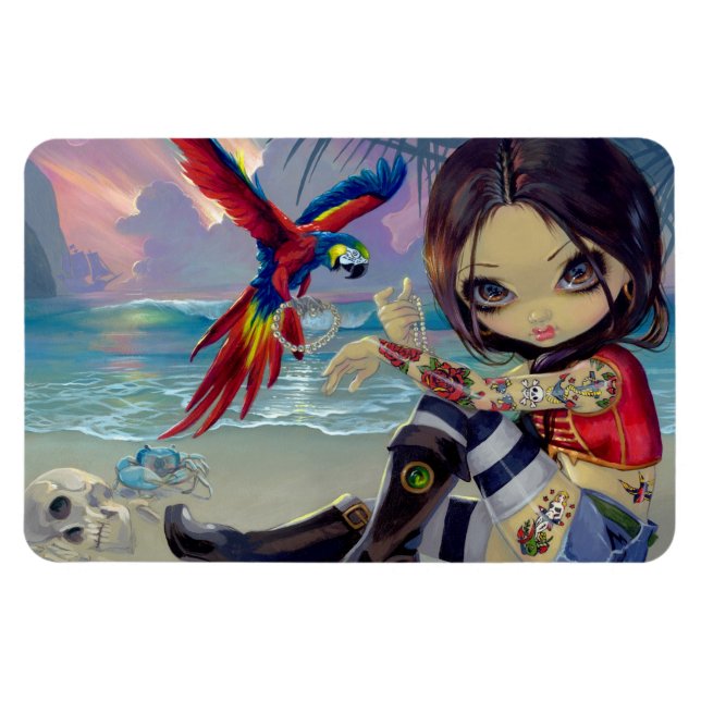 Introducing my newest girl in my Pirates series - "Bootstrap Betsy!" I love her colourful parrot friend bringing her strands of pearls! Actually, I love everything in this painting, from her classic tattoos - to the blue land crab approaching the half-buried skeleton - to the tropical sea - the palm trees reflecting in her eyes - the distant ship on the horizon - pretty cool! My own original acrylic painting.