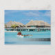 Postcard of two men in an outrigger canoe bringing breakfast service Polynesian style to honeymoon guests in a luxury overwater resort on the tropical, pacific Island Bora Bora, French Polynesia with a fading bar and the text: 'Bora Bora'..