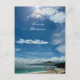 The front of the postcard showcases a radiant sunset over Boracay's horizon, painting the sky in blue. Silhouettes of palm trees stand tall against the warm glow, while gentle waves kiss the shore, reflecting the mesmerising beauty of the island.