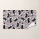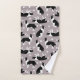 Cute black and white border collies sit, stay and rollover on a grey background with pawprints, a fun dog themed pattern..