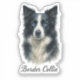 Intelligent Border Collie dog portrait, piercing blue eyes, black and white coat, alert expression, fluffy fur texture, artistic watercolor style, "Border Collie" text in elegant script font below, similar artistic quality to beagle design.