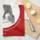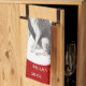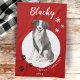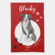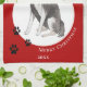 Border Collie Drawing Paw Merry Christmas kitchen towel. Fun and cute border collie drawing. The background is red with white snowflakes and black paw prints. Personalise the towel with name and year. A lovely holiday keepsake for a border collie owner.
