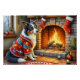A cozy Christmas artwork featuring a beautiful Border Collie sitting beside a glowing fireplace adorned with stockings and sparkling Christmas lights. This festive holiday scene captures the Border Collie’s intelligence, loyalty, and gentle nature, making it perfect for dog lovers and warm seasonal decor. Add a touch of heart and holiday cheer to your home with this charming pet-inspired artwork.
