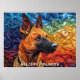 This is an abstract colourful dog portrait of a Belgian Malinois breed dog in paper quilling art style. It is a lovely poster for dog lovers and Belgian Malinois owners.