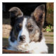 A beautiful border collie farm dog caught hiding behind a tractor trailer.