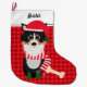 A tri colour border collie wearing a red Santa hat, striped scarf, and green boots looks out from the front of this cute Holiday stocking. Beside him is his treasured bone. The images are placed on a diamond check red background. At the top is a white border with your custom text in black. The back of the stocking has the same pattern without the text or dog image.