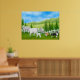 Original fine art design of a flock of sheep and border collies on a quality poster print by designer/illustrator Carolyn McFann. A great gift for farmers, and livestock fans.