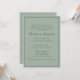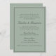 This wedding invitation features a dusty sage green background, soft black refined serif lettering, and a clean border.