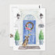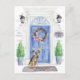Announce your new address with our stylish announcement featuring a Border Terrier, blue front door, welcome mat, slate sign, topiaries and a floral wreath set on a grey brick background.