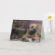A Border Terrier puppy sat on a rock with pretty purple heather behind him, great birthday card for any dog lover especially those who love Border Terriers, but suitable for all