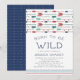 Adorable baby shower invitations for your wild one on the way feature a border of colourful feathered arrows in navy, teal and red. "Born to be wild" appears in navy blue lettering, with your baby shower details beneath.