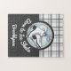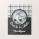 The design features a pair of ice skates over a snowflake crest and an off-white tartan pattern background. This elegant winter sports design with personalised text serves as a cute modern and unique jigsaw puzzle.