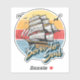 Retro style illustration with "Born to sail" text design and sailing ship at sunset on the sea decoration
