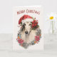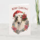 Borzoi Dog Santa Hat Red Poinsettias Christmas Card
