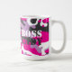 Custom mugs and cups with "Boss Lady" in stencil typography with pink camouflage on both sides.