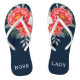 Botanical-inspired flip flops featuring vibrant watercolor red peonies and green leaves - The text is fully customizable: change the wording, font color and size to your liking.