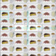 Fabric design features an original marker illustration of a row of classic Boston, Massachusetts foods: baked beans, clam chowder, Boston cream pie, and beer. Great for your favourite Bostonian foodie!