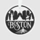 This fresh black-and-white illustration of the Boston skyline features many familiar landmarks, including the capitol building, the custom house tower, the Hancock, Old Hancock, and Prudential buildings, as well as the Zakim bridge and financial district.