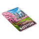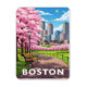 A picturesque park scene with blooming cherry trees framing a view of the Boston skyline under a bright blue sky with fluffy clouds.