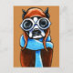 Art for Boston Terrier lovers of a BT wearing aviator costume rendered using ink and coloured pencils. Background coloured digitally.