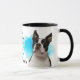 A portrait of an adorable black and white Boston Terrier dog is the feature on two sides of this mug. Each image is placed on a bright blue splatter background. Between the two images is the text that describes this loyal and playful companion, with "the BOSTON TERRIER" in black at the bottom. All the text is easily customised to anything you'd prefer so that you may describe your own loyal friend.
