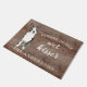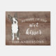 Funny beware of the wet kisser" Boston Terrier Dog door mat set on a rustic faux background. Visit our shop to view a large assortment of dog breads