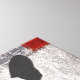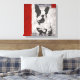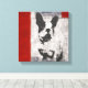 A black and white photo of a boston terrier that has been processed so it has a scratched granite looking surface giving it a retro grunge look. A red textured border gives this creative image a splash of colour.