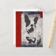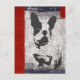 A black and white photo of a boston terrier that has been processed so it has a scratched grey grunge faded retro look. A red textured border gives this creative image a splash of colour.