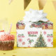 The repeated pattern on this Christmas wrapping paper includes an image of a Boston Terrier puppy sitting in a wicker basket filled with flowers. The basket is decorated with a red bow, and sits beside a Holiday tree. Stylised red and green text says MERRY CHRISTMAS", and your own signature is in two fields for you to customise. Other images included in the pattern include red decorative snowflakes, candy canes, and a peppermint lolly pop.