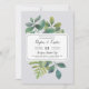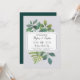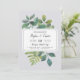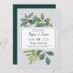 Vintage botanical engagement party invitation displays your party details uniquely arranged in inky off-black block and calligraphy lettering, on a background of painted green watercolor leaves, branches, ferns and foliage. Invitations reverse to solid dark forest green.