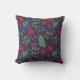 Elegant throw pillow with botanical autumn illustration. Bright maple, holly, mistletoe and juniper pattern on dark blue background.