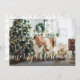 Custom calligraphy photo Merry Christmas cards featuring hand lettered title and watercolor botanicals in brown, purple and grey colours. Easily personalise these photo Christmas cards with your image, family name and text.
