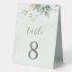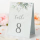 Beautiful wedding table numbers featuring watercolor eucalyptus and gold leaves.