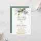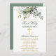 Modern Elegant First Holy Communion Invitation includes watercolor eucalyptus leaves and other beautiful botanical greenery foliage. Gold Cross. Sage Green Back.