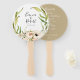 Beautiful watercolor botanical forest foliage and garden floral wreath, wedding program hand fans. Back features solid taupe colour background and lines of text for a detailed list of the wedding party.