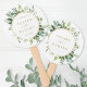 This wedding hand fan features painted watercolor eucalyptus greenery, green leaves with a gold round circle frame. For more advanced customisation of this design, Please click the "Customise further" link. Matching items are also available.