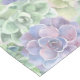 Table cloth with a pattern of watercolor painted succulents in shades of pastel green and purple.