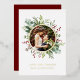 This photo thank you card features painted watercolor eucalyptus, green leaves, red berries, pine branches, and a gold foil circle frame with optional text on the back. For more advanced customisation of this design, please click the BLUE DESIGN TOOL BUTTON.