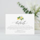 Add the perfect finishing touch to your wedding suite with this customisable details card, featuring a beautiful watercolor design of lemons, blossoms, and greenery. This card is ideal for sharing important event information, such as accommodations, directions, or your wedding website, with your guests. The vibrant watercolor elements bring a refreshing, natural charm to your celebration, making it perfect for a garden, rustic, or nature-inspired wedding. Personalise the details card with your unique event information to ensure your guests have everything they need for your big day. Whether paired with your invitations or as a stand-alone piece, this details card is both functional and stylish, offering a cohesive look for your wedding stationery.