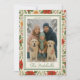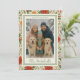 This elegantly designed classic holiday greeting card features seasonal botanical elements such as green holly leaves, red berries, classic Poinsettia flowers, Christmas mistletoe, cinnamon sticks, and orange slices. It provides space to customize the front with your family photo and includes a personal message on the back. Combining ornate and stylish vintage elements, this card is perfect for sharing Christmas messages and wishes in a traditional botanical style, making it an excellent choice for a charming and sophisticated holiday theme.