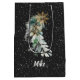 Wrap your holiday gifts in timeless elegance with this medium-sized glossy gift bag featuring a festive watercolor arrangement of pine branches, white berries, pinecones, and gold-toned accents. Set against a rich black background speckled with white snow-like dots, the design evokes a cosy winter night and blends modern rustic charm with botanical Christmas sophistication. The front includes editable text for a custom name, printed in elegant white script, while the side reads “Merry Christmas” in vertical cursive.