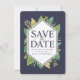 Announce your wedding in chic style with our Botanical Modern save the date cards. Bold and dramatic cards feature an elongated hexagon geometric element that holds your wedding details -- names, wedding date and location -- surrounded by watercolor painted botanical leaves on a deep navy blue background. A modern mix of block and calligraphy script typefaces gives these save the date cards a chic and elegant look.