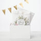 A modern botanical wreath is decorated with white hydrangea buds a a splash of pink rose buds. The wedding couple names are written in a large script font. Baby Shower and the thank you sentiment follow.