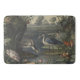 vintage painting of a botanical scene with blue cranes by a river surrounded by beautiful big flowers