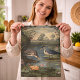 vintage painting of a botanical scene with blue cranes by a river surrounded by beautiful big flowers