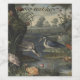 vintage painting of a botanical scene with blue cranes by a river surrounded by beautiful big flowers