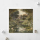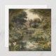vintage painting of a botanical scene of swans swimming in the water in an English garden with water lilies, bridges and many exotic flowers