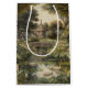 vintage painting of a botanical scene of swans swimming in the water in an English garden with water lilies, bridges and many exotic flowers