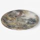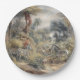 vintage painting of a botanical scene with zebras in an oasis with palm trees and lions roaming by the river