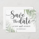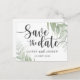 Simple and elegant save the date postcard. Featuring a minimalist, hand written style calligraphy and tropical foliage in green. Easy to customise with your unique information.